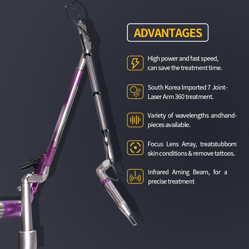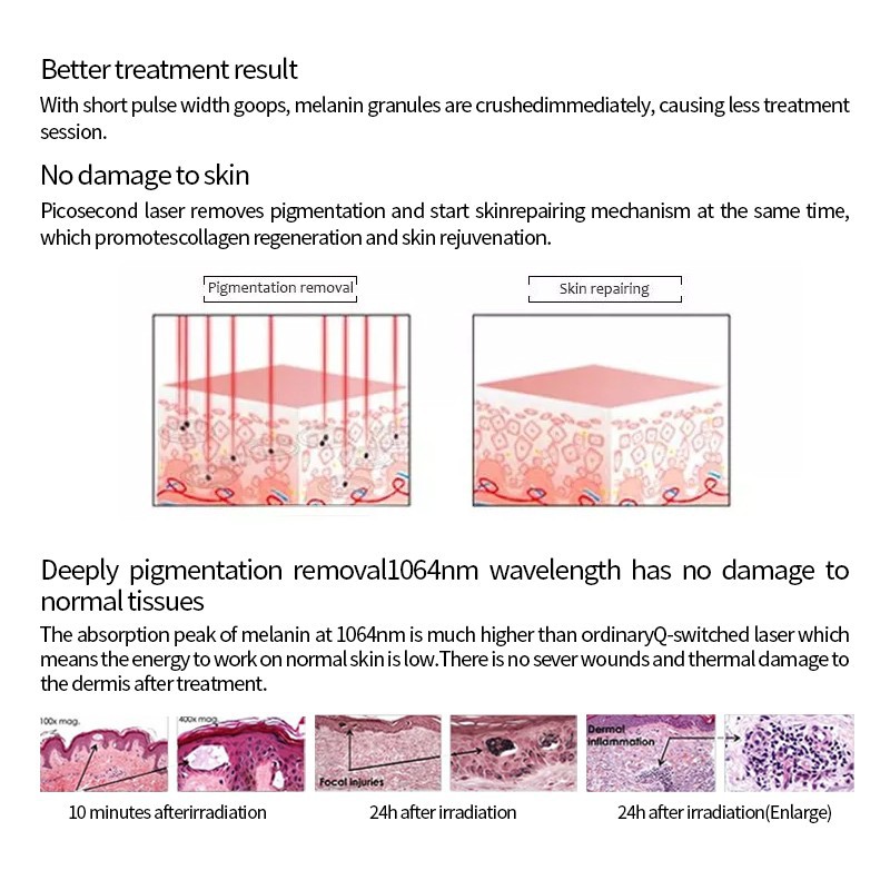 Το λέιζερ Picosecond χρησιμοποιεί λειτουργία εξόδου πολύ σύντομου παλμού, αντί για ελαφρύ μηχανικό κρουστικό κύμα, η χρωστική ουσία θρυμματίζεται σε λεπτά κοκκώδη μέσω εστιασμένης ενέργειας, είναι πιο πιθανό να απορροφηθεί από τον μεταβολισμό του σώματος. Το λέιζερ Picosecond θα είναι να ελαχιστοποιήσει τις παρενέργειες της θερμικής επίδρασης, μπορεί να επιτύχει τον στόχο της σχεδόν να λύσει όλα τα είδη των κηλίδων χρωστικής ουσίας, είναι καλύτερο από το παραδοσιακό λέιζερ.
